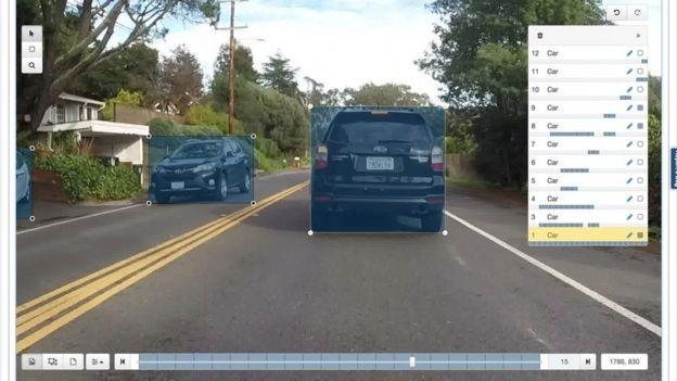 布兰达先是上传一张图片,然后用鼠标跟踪里边的所有物体。人、车辆、路牌、车道标记——甚至天空,还要特别说明是晴朗的还是阴霾的天空。将数百万张这样的图片输入到人工智能系统中,意味着(比方说)一辆自动驾驶汽车可以开始“识别”现实世界中的物体。数据越多,理论上机器越智能。